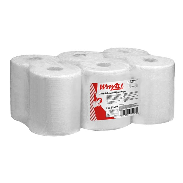 WypAll L10 centrefeed roll, designed for light duty hygiene wiping and perfect for tasks like cleaning food preparation and service surfaces. Compatible with the portable WypAll Reach dispenser (6221) which ensures rolls remain enclosed to help prevent against transmission of food-borne bacteria. 6 rolls x 430 sheets, 1 ply, white (2,580 total)